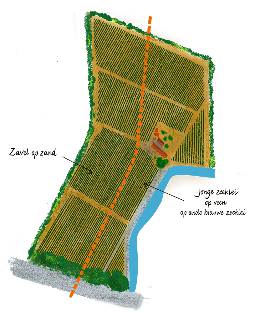 Het westelijke deel van de wijngaard is voor de helft gelegen op een oude kreekrug (zavel op zand) die in het oosten overgaat in een overgangsgrond (jonge zeeklei op oude blauwe zeeklei). Door de bedijking en afwatering van Walcheren in de 12e eeuw ging het veen, door de blootstelling aan zuurstof, inklinken en dat zorgde voor de hogere ligging van de oude kreekruggen in het landschap.