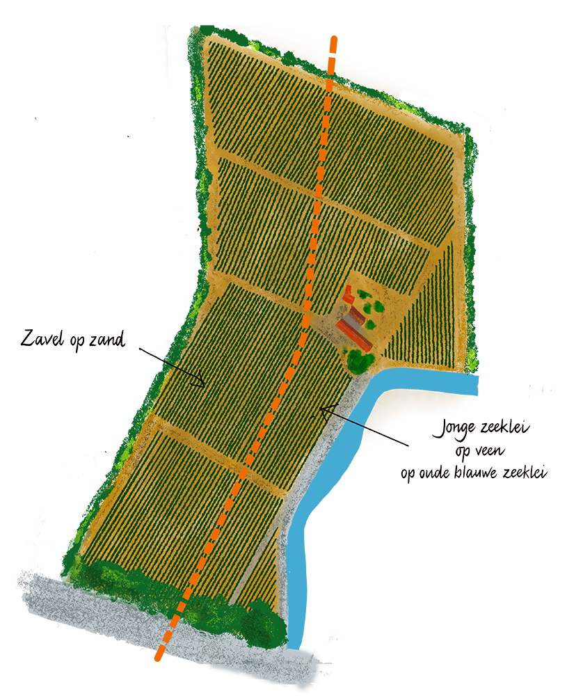 Het westelijke deel van de wijngaard is gelegen op een oude kreekrug (zavel op zand) die in het oosten overgaat in een poelgrond (jonge zeeklei op veen op oude blauwe zeeklei). Door de bedijking en afwatering van Walcheren in de 12e eeuw ging het veen, door de blootstelling aan zuurstof, inklinken en dat zorgde voor de hogere ligging van de oude kreekruggen in het landschap.