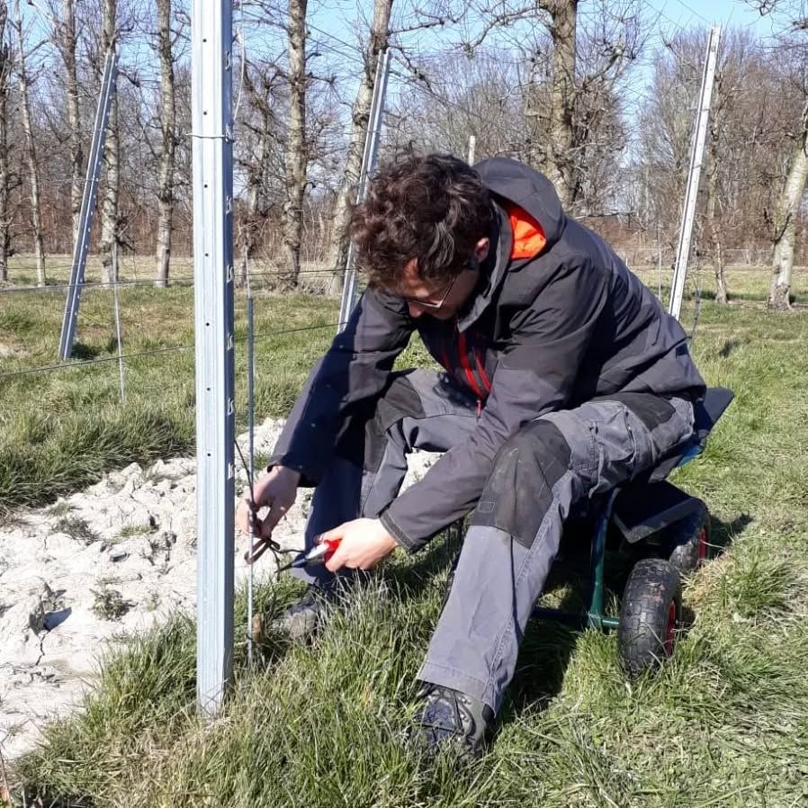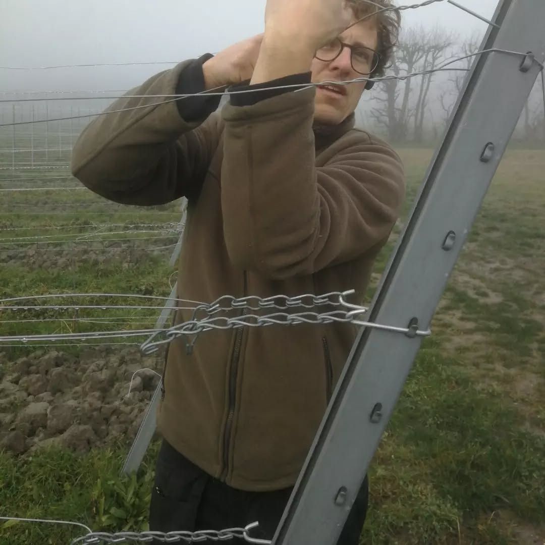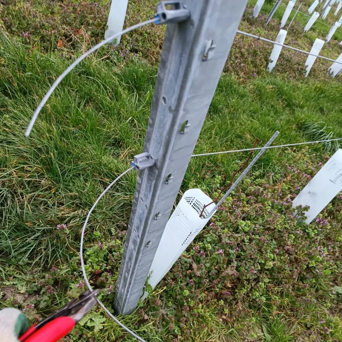 Het aanbrengen van de draden is een heel karwei, vele kilometers moeten er voor worden afgelegd – maar het vordert rap! Eind januari zit die etappe er op zodat we ons begin maart volledig kunnen focussen op het snoeien.