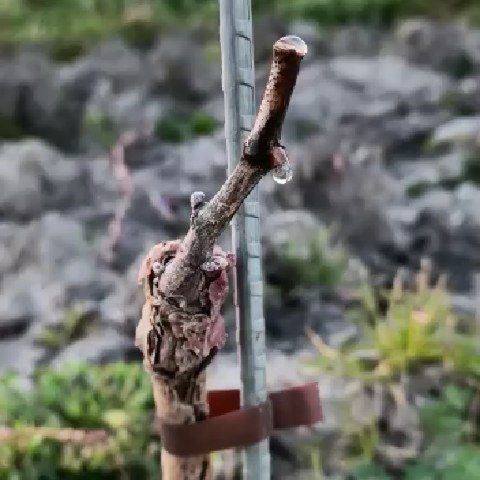Je ziet het sap uit de onlangs gesnoeide uiteinden druppelen. We noemen dit ook wel het bloeden van de wijnstokken. Dit is normaal en zeker niet ernstig. Je ziet dit ook soms bij aardbeien waar waterdruppels ontstaan aan het einde van de bladeren.