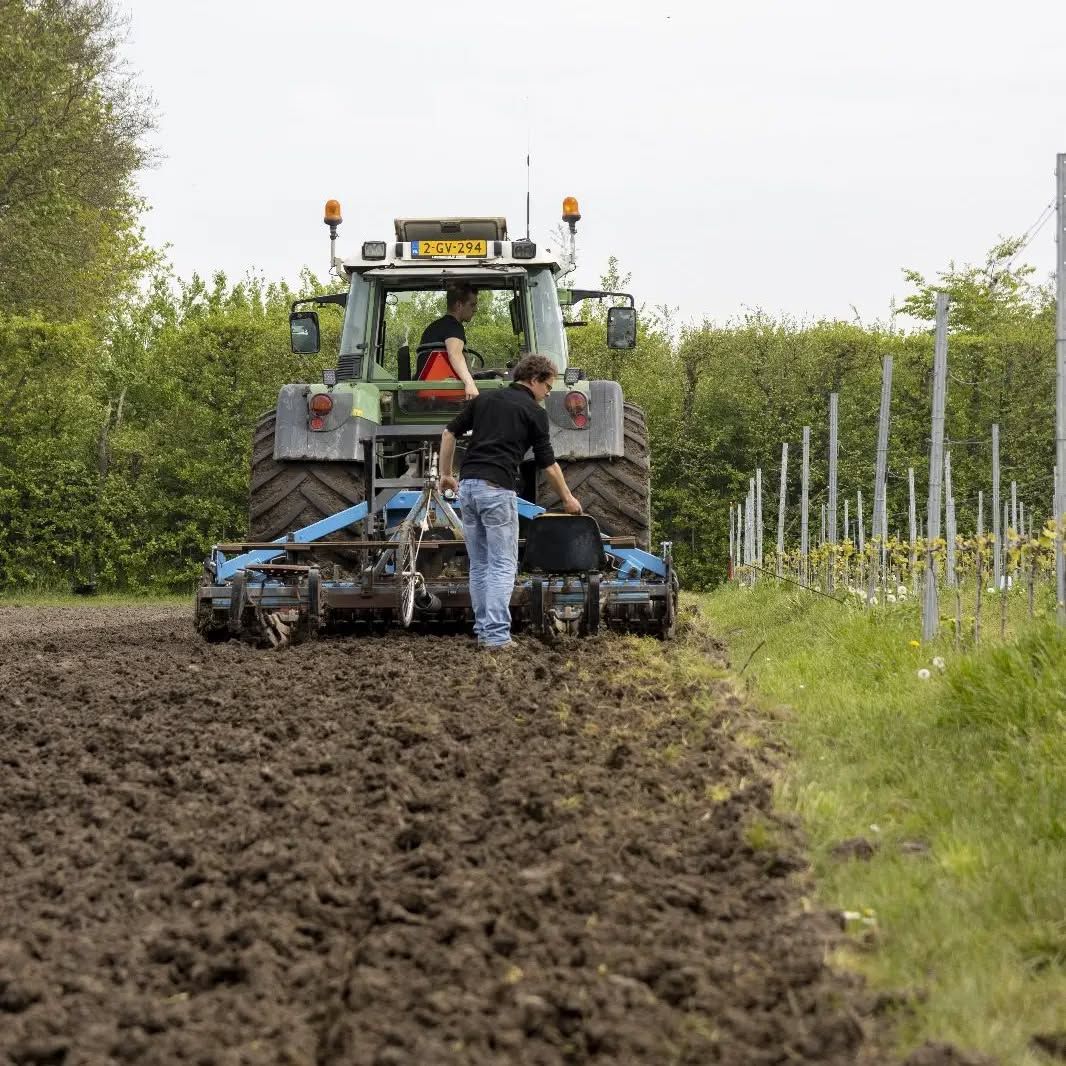 Tijd om de lanen in te zaaien. Door eerst te roteren wordt het onkruid verhakseld en de grond losgemaakt.