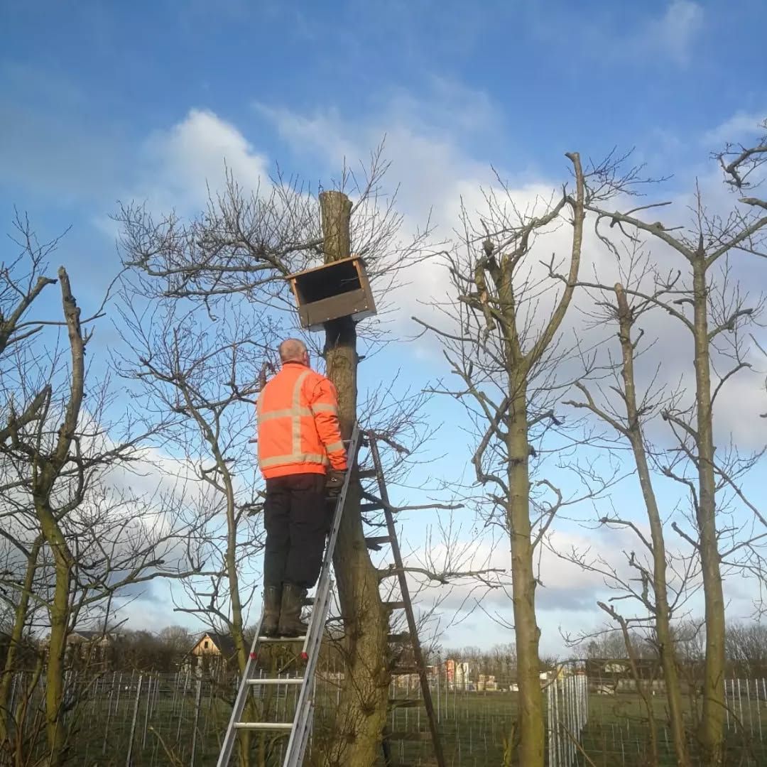 De nestkast hangt hoog en uit de wind zodat hij zeker in de smaak zal vallen bij de nieuwe bewoners.